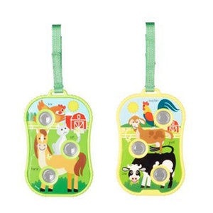 This set of two sturdy double-sided jumbo Poke-A-Dot tags have built-in straps that easily tether to a stroller, diaper bag, car seat, high chair, and more, making them a terrific travel toy that is always close at hand! Poke the irresistible buttons next to the adorable farm animals to hear satisfying clicks and pops. Textured corners promote even more sensory exploration.